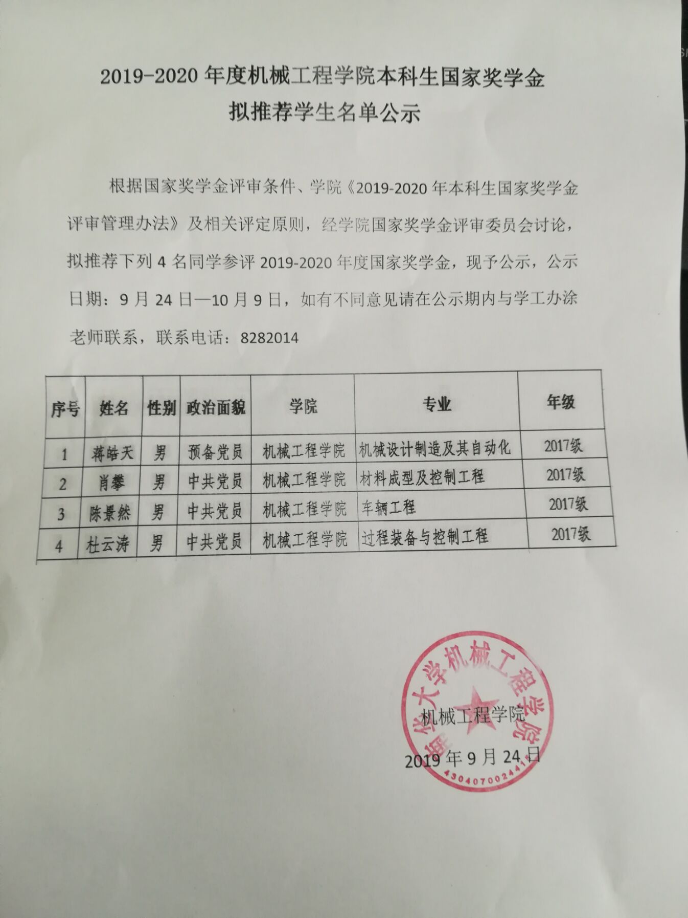 2019-2020年度PA视讯集团官网本科生国家奖学金拟推荐学生名单公示