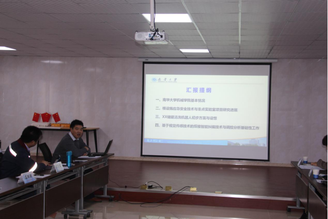 交流会上中核五公司工程研究院的程定富院长首先介绍了中核五公司的科研情况;随后我院的唐德文副院长介绍了我院的基本情况及核设施应急安全技术与重点实验室的科研项目进展,并针对中核五公司在清洗机器人及焊接过程中的图像识别与处理技术等方面的需求进行了的反馈,详细介绍了我方的初步方案;刘列教授就大功率激光焊接技术进行了介绍。