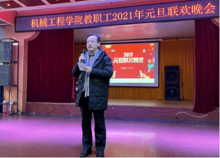 院长邱长军教授上台致新年贺辞,对学院2020年在教学、科研、学科建设、人才引进等各个方面取得了傲人的成绩做了回顾,本科生学科竞赛获国家级奖项78项,考研录取率创历史新高,就业率达95%,位列全校前三。对新引进的人才表示热烈的欢迎、期望他们在新的工作岗位取得更好的成绩,对全体教职工表达新年的问候和祝福,并预祝晚会取得完满成功。