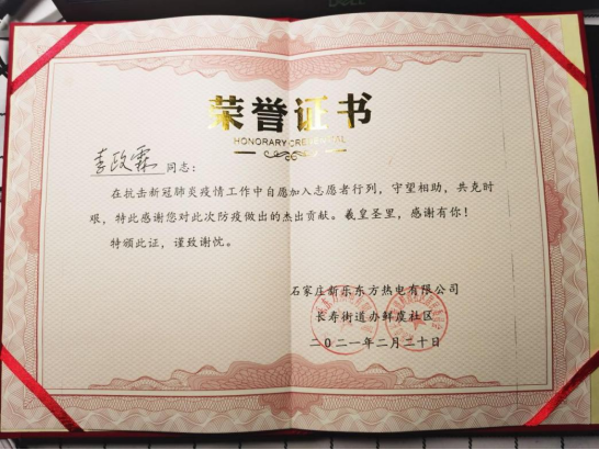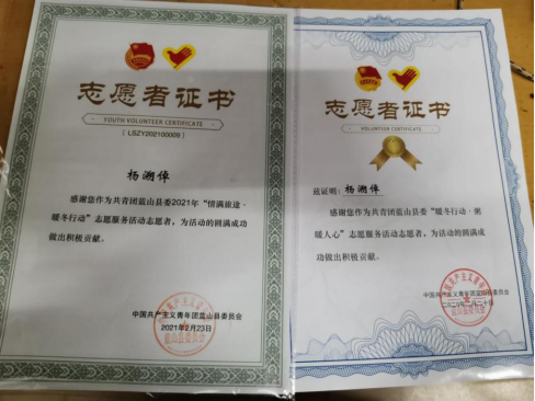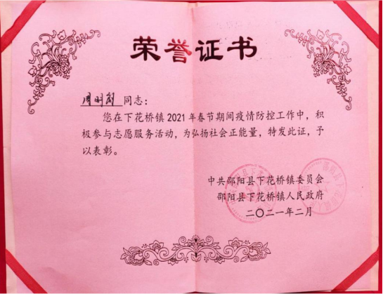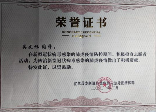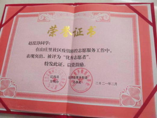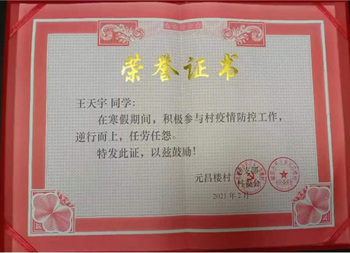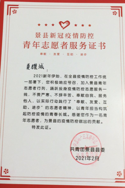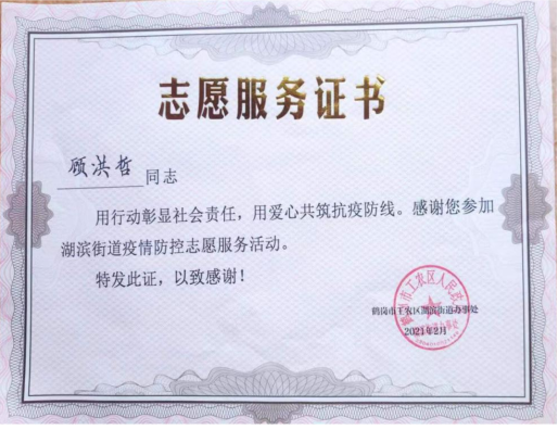 2021年是中国共产党成立100周年,是“十四五”规划开局之年。为引领广大学生深入学习贯彻习近平新时代中国特色社会主义思想和党的十九届五中全会精神,扎根中国大地了解国情民情,通过社会实践坚定理想信念、站稳人民立场、练就过硬本领、投身强国伟业。在本次组织开展的2021年寒假社会实践活动中,我院能动1801班杨溯倬、机类2003班王天宇、机类2004班周明朗、能动1902班吴文旭、机类2017班夏耀城、机类2005班李政霖、机类2007班顾洪哲、智造1801班赵泓铮、智造1801班郭明延、机械1902班邹佳华等10名同学积极投身到家乡疫情防控工作中去,将浓浓的爱国之情化作坚定的报国之行,用实际行动为打赢疫情防控阻击战贡献青春力量,荣获“优秀志愿者”称号。