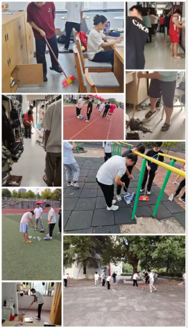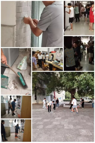 在三省园四栋,同学们都积极行动,用毛巾擦拭门窗、拖把清洁地面,还使用毛刷将墙壁上的牛皮癣清理掉,老师们也使用卫生工具铲除宿舍墙壁的牛皮癣;在雨母校区田径场及图书馆七楼,学生们都自带工具,对场所进行仔细清扫,为同学们提供了一个整洁舒适的学习生活环境。