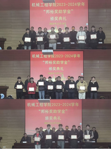 12月19日下午,PA视讯集团官网于雨母校区崇业楼学术报告厅举行了“邦裕奖助学金”颁奖仪式。机械专业95级校友思诺冶金设备(上海)有限公司董事长王邦裕、学院院长邱长军、党委书记王湘江、副院长柏兴旺出席了此次典礼,院党委副书记唐康伟主持。