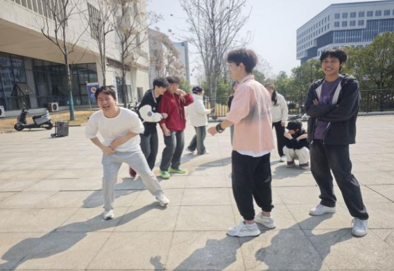 随后,活动转移至户外进行“绽心无忧”环节。此环节设计了三个特色活动,形成递进式干预机制。“日不落广场舞”通过充满韵律的运动,刺激内啡肽分泌,成功完成情绪唤醒;“情绪动作接力”借鉴心理剧的表达性艺术治疗技术,引导参与者建立非言语沟通渠道,促进情感交流;“解手链”团体协作项目运用团体动力学原理,让同学们在破解实体困境的过程中重构认知图式,增强团队协作能力和心理韧性。
