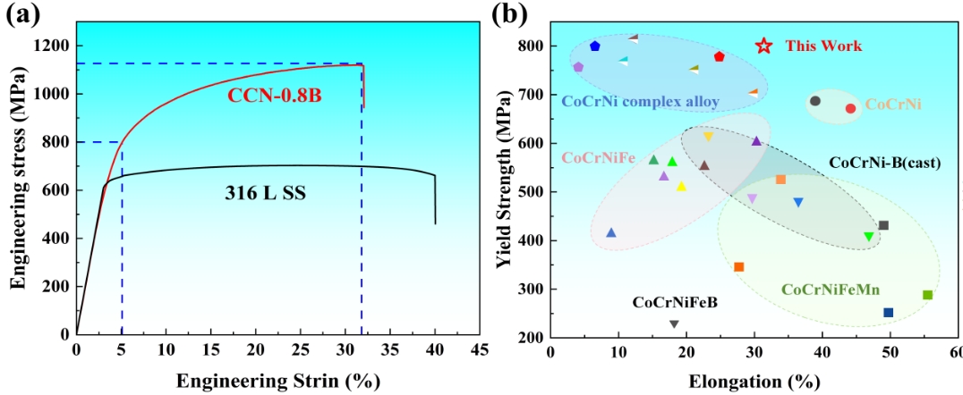 图3(a)室温下LPBF制造的CCN-0.8B合金和316L SS的应力-应变曲线;(b)CoCrNi系中熵合金的力学性能对比图