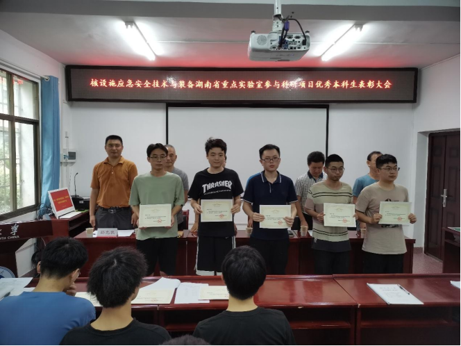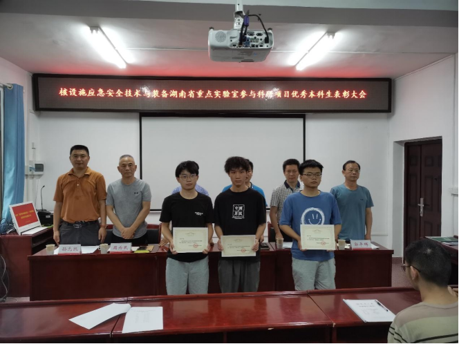 6月9日下午,核设施应急安全技术与装备湖南省重点实验室在实验室三楼会议室召开了优秀本科生表彰大会,对11名参与“葫芦娃Ⅲ型机器人”科研项目的优秀本科学生进行了嘉奖。重点实验室主任、PA视讯集团官网副院长唐德文教授,校党委委员、重点实验室总经济师兼副主任刘文君教授,教务部副部长、重点实验室总工兼副主任戴剑勇教授,重点实验室副主任孙允凯副教授,项目组总工程师周为民教授、郭平辉教授,实验室全体教师和实验室研一、研二研究生及受表彰的本科学生参加了会议。会议由戴剑勇副主任主持。