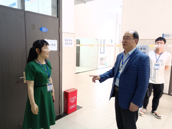 4月1日下午,副校长王福俤、研究生院院长李乐带队深入我院研究生招生复试现场指导工作,检查研究生复试实施情况、现场操作程序等,并向复试组成员表示慰问。