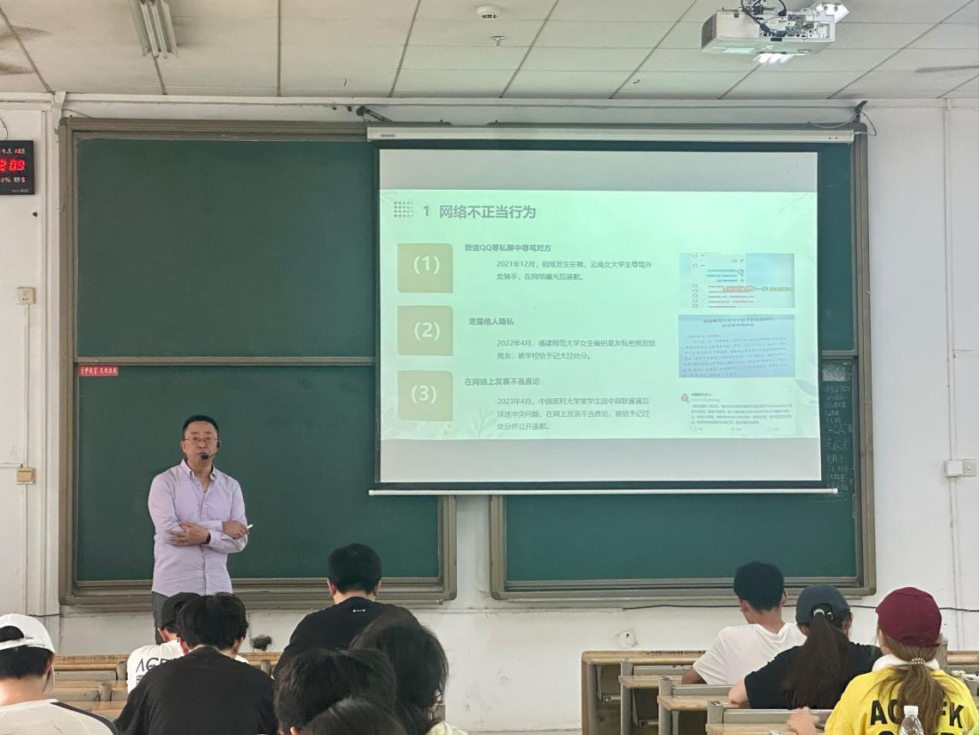 讲座聚焦网络素养内涵与安全风险防范。主讲人蔡军老师结合近年高校典型案例,深入剖析网络失范行为的危害,强调网络并非法外之地,通过《民法典》相关条款解读及公安机关打击网络谣言的权威数据,警示学生需严守网络道德规范,做到“慎独”与“自省”。针对网络沉迷、信息污染等现实问题,主讲人系统分析网络对大学生身心的双面影响,呼吁理性使用网络工具,警惕“信息茧房”。