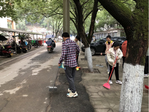 我们支部负责的区域是博学园学生宿舍和食堂之间的左侧橱窗及马路。三点集合完毕,大家都热火朝天地行动了起来。有的带了抹布,细致认真地抹橱窗和底下的瓷砖;有的带了扫把,把周边和马路上的落叶扫成一堆;有的带了撮箕,一起配合,将落叶等垃圾倒进垃圾桶。还有的同学甚至将台阶上的灰都打扫得干干净净。
