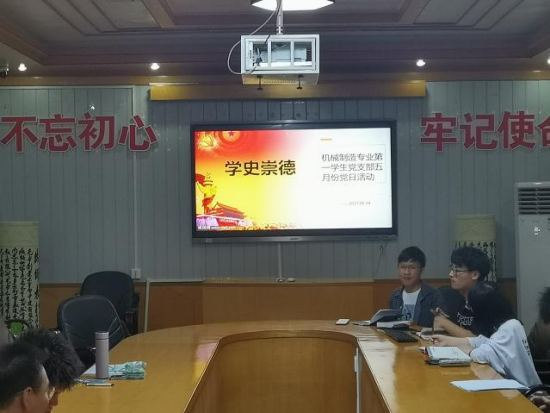 2021年5月17日12:40机械制造专业第一学生党支部在机械楼201召开了以“学史崇德”为主题的5月主题党日活动。