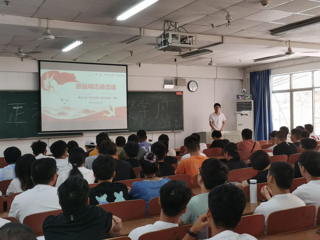 接着,PA视讯集团官网研究生理论宣讲团成员周楠为大家作“断肠明志铸忠魂”的主题演讲,他为大家讲述了烈士陈树湘在湘江战役中断肠明志,以年轻的生命实现了“为苏维埃新中国流尽最后一滴血”的誓言的故事。整场报告主题鲜明、脉络清晰、内容丰富、讲解透彻,既有历史纵深感,又有现实针对性,现场同学深受触动。